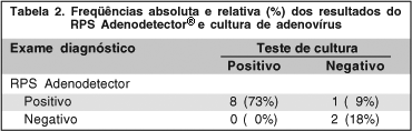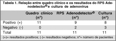 A cultura para adenovírus foi positiva em 8 pacientes (72,7%), enquanto que o RPS Adenodetector® foi positivo em 9 (81,8%). Oito pacientes apresentaram teste rápido e cultura positivos. Um paciente apresentou teste rápido positivo com cultura negativa. Todos os pacientes com teste rápido negativo apresentaram cultura negativa (Tabela 1).