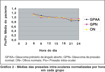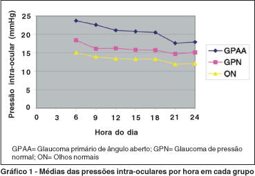 O grupo de pacientes com GPN apresentou maior Pio e maior flutuação diária da Pio do que o grupo de indivíduos com ON. Alguns estudos(18,27) também encontraram maiores valores da Pio e da variação diária da pressão em pacientes portadores de GPN, quando comparados a indivíduos normais, embora outros autores(28-29), não tenham observado diferenças significativas entre as flutuações diárias da Pio de pacientes portadores de GPN e indivíduos com ON.