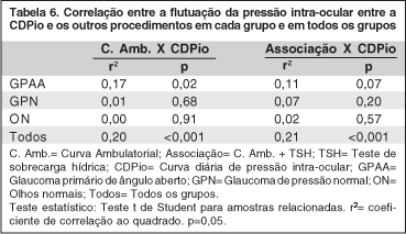 Embora tenha havido correlação significativa entre a flutuação da associação da curva ambulatorial com o TSH e a flutuação da CDPio em todos os grupos, o valor do coeficiente de determinação r2 foi pequeno (0,21). Não houve ainda, diferença estatisticamente significativa entre a flutuação da associação da curva ambulatorial com o TSH e a flutuação da CDPio, mas o valor de p foi marginal (0,06). Estes dados indicam que a previsão da flutuação diária da Pio, através da associação da curva ambulatorial com o TSH, teria pouco valor prático. Os gráficos 4 e 7 ilustram este fato, ao demonstrarem a dispersão dos valores de flutuação da Pio da associação da curva ambulatorial com o TSH e da flutuação da pressão na CDPio (Gráfico 4) e a dispersão das diferenças da flutuação entre os dois métodos (Gráfico 7).