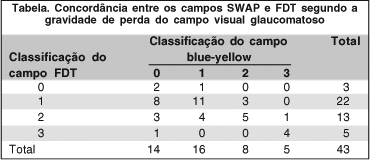 Ao se comparar os campos em relação à gravidade da lesão glaucomatosa, evidenciamos uma concordância moderada (k=0,319), porém altamente significativa (p<0,001). É possível notar que a maior discrepância ocorre em pacientes com glaucoma inicial (Tabela). Uma possível explicação para o fato relaciona-se ao efeito aprendizado do FDT. Apesar de todos os pacientes incluídos terem sido submetidos a um exame de "screening" prévio, os pacientes eram inexperientes com o FDT, e com isso a ocorrência de resultados falso-positivos pode ser esperada(13). Entretanto, todos os pacientes já haviam realizados pelo menos dois exames de campo visual. Com isso, acreditamos que os resultados da perimetria azul-amarelo sejam mais confiáveis.