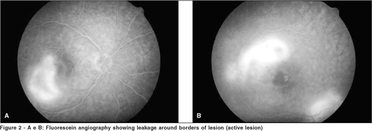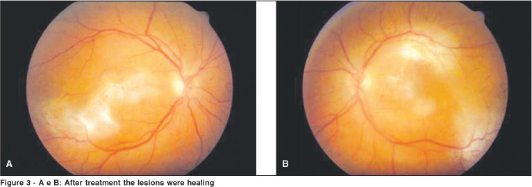Laboratory studies including fluorescent treponemal antibody-antibody screen (FTA-ABS), Lyme disease, complete blood count (CBC), erythrocyte sedimentation rate (ESR), HIV screening, tuberculosis skin testing (purified protein derivative - PPD), chest x-ray and three sets of blood cultures were performed with normal results. However, the patient showed serum positive IgM (>0.600) and elevated IgG (>300 IU/ml) anti-Toxoplasma gondii. The patient was treated with pyrimethamine, folinic acid, and sulfadiazine for 5 weeks. After treatment the lesions were healing (Figure 3A, 3B) and his vision improved to 20/200 (right eye) and 20/100 (left eye) within 2 months.
