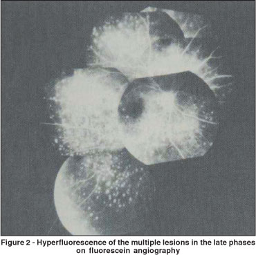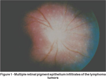 A group of researchers from the National Eye Institute in the United States(40) published different fluorescein angiographic patterns confirmed by histopathologic analysis. The most common pattern were disturbances at the RPE level occurring in 31 eyes from 17 patients with primary intraocular lymphoma. These disturbances of the RPE were: granularity (61%); blockage (55%) and late staining (45%), more than one could be found in the same patient. Our cases had neither characteristics. In this research RPE detachment and punctate hyperfluorescent lesions were less common. These clinical pictures should be recognized so that the diagnosis of lymphoma may be made as early as possible.