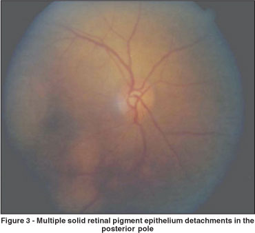 When large lesions resolve, large foci of geographic atrophy of the pigment epithelium may simulate that seen in degenerative or postinflammatory disorders. It was published(4), that when present, the multiple solid RPE masses are very suggestive of large-cell lymphoma. It so happened in our case 2 when the patient presented multiple RPE solid detachment predating central nervous system symptom involvement.