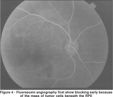 The left eye ocular fundus was normal. Fluorescein angiography (FA) of the patient's right eye revealed first show blocking early because of the mass of tumor cells beneath the RPE. The blocking is especially apparent in the macula where the mass appears to be thickest (Figure 4).