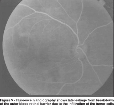 The blocking is of the choroidal fluorescence and because the cells lie in front of the choroid. Then the FA shows late leakage from breakdown of the outer blood retinal barrier, again due to the infiltration of the tumor cells (Figure 5). Fluorescein angiography of the left eye was normal.