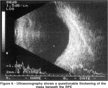 Ultrasonography of the right eye shows a questionable thickening of the mass beneath the RPE (Figure 6)