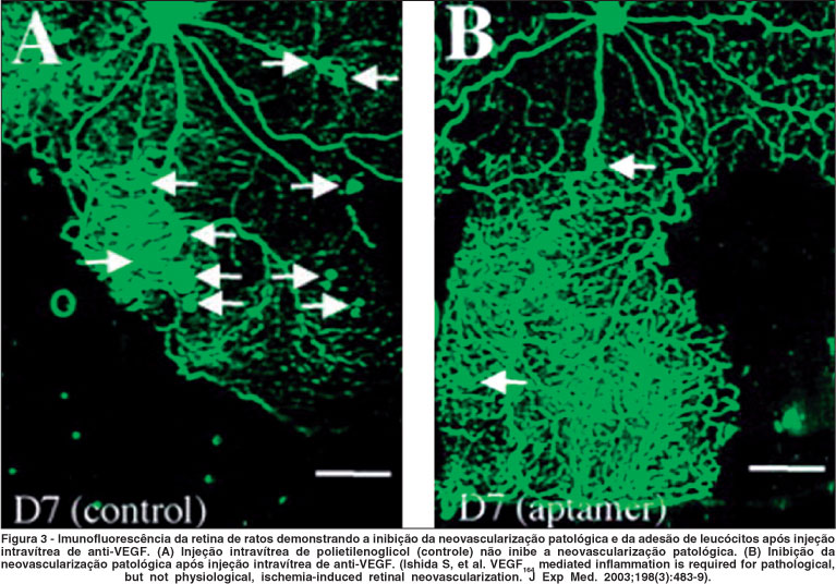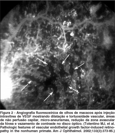 Os estudos em animais mostram que a expressão aumentada de VEGF é uma condição necessária para a indução da neovascularização ocular, e que somente esse aumento é suficiente para induzir esse processo. O aumento da expressão de VEGF no EPR e nos fotorreceptores de ratos promove aumento da permeabilidade vascular, aumento da adesão leucocitária e formação de neovasos de coróide(35). Em macacos, a injeção intravítrea de VEGF provoca o aparecimento de neovasos retinianos cujas características histológicas e funcionais são muito semelhantes aos encontrados nas retinopatias proliferativas(42-43) (Figura 2). Por outro lado, a injeção intravítrea de anticorpo anti-VEGF previne a formação de neovasos sub-retinianos(23) (Figura 3).