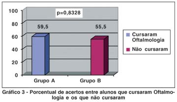 Em relação aos alunos que haviam cursado a disciplina de Oftalmologia (Grupo A), a média de acertos foi de 59,5%. Dentre os demais (Grupo B) de 55,5%, conforme gráfico 3. Não houve diferença estatisticamente significante entre os dois grupos (p=0,8328).