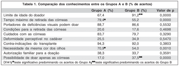 A tabela 1 apresenta a comparação do conhecimento entre os Grupos A e B. Foi identificada diferença estatisticamente significante em 4 questões. Em relação ao tempo de retirada das córneas (p<0,0000) e da necessidade da mesma cor dos olhos para ser doador (p<0,0010), o Grupo que cursou Oftalmologia (A), apresentou maior índice de acertos. As questões que abordavam o limite de idade para ser um doador (p<0,0000) e a possibilidade de doar apenas as córneas para o transplante (p<0,0000) apresentaram predomínio de acertos no Grupo B (não cursaram Oftalmologia).
