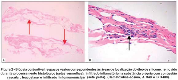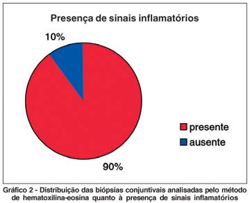 Estes autores(10), relataram que as moléculas de óleo de silicone de baixo peso molecular são capazes de difundir através dos tecidos, levando a uma reação tóxica e/ou inflamatória. No presente estudo, infiltrados inflamatórios estiveram presentes em 27 (90%) amostras (Gráfico 2), mesmo para as amostras com resultados negativos para a presença do óleo, podendo tratar-se de um viés de amostragem, sendo possível que o óleo de silicone estivesse presente em outras partes da conjuntiva não biopsiada. Ressaltamos também que a própria agressão provocada pelo procedimento cirúrgico pode por si só justificar a presença de reação inflamatória crônica.
