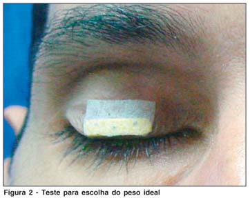 Os pesos de ouro variam entre 0,6 e 1,6 g, com incrementos de 0,2 em 0,2 g(2-3). A escolha do peso apropriado foi feita fixando-os na pálpebra superior do paciente com fita adesiva (Figura 2): o peso ideal produziu o fechamento palpebral completo sem causar ptose. A maioria dos pesos utilizada neste trabalho foi de 1,2 g.