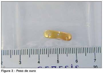 O implante do peso de ouro foi realizado sob anestesia local em todos os casos. Após infiltração de lidocaína a 2% com vasoconstritor na pálpebra superior do lado paralisado, fez-se incisão horizontal, entre 10 e 15 mm, com bisturi lâmina 15, na altura do sulco palpebral. Realizou-se dissecção do músculo orbicular expondo a placa tarsal. O peso de ouro (Figura 3) foi fixado sobre o tarso com três pontos, sendo o furo central colocado na direção de uma linha vertical imaginária, traçada do centro da pupila ao tarso e os outros dois pontos fixados medial e lateral a este primeiro ponto, utilizando-se o fio de seda 6.0. Realizou-se sutura do plano muscular sobre o peso de ouro, com fio absorvível 6.0 com o objetivo de proteger o peso de ouro e prevenir possível deslocamento ou extrusão. A sutura da pele foi realizada com seda ou mononylon 6.0(2).