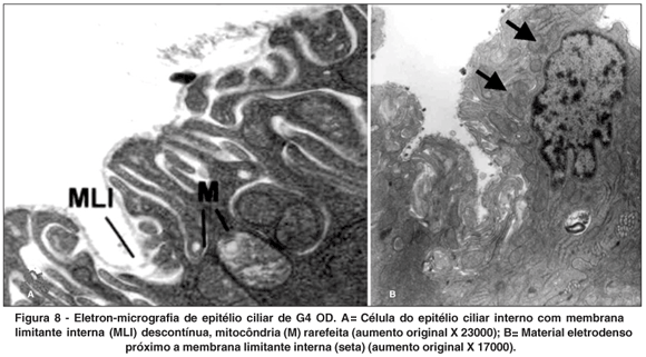 Os olhos direitos (OD) dos animais de G1 (submetidos à realização de retalho escleral e aplicação de MMC) apresentaram a membrana limitante interna com espessamento focal e ou descontinuidade. Foi também observado pequeno acúmulo de material eletrondenso de tamanho variado externo à membrana basal. Algumas células do epitélio ciliar interno apresentaram-se retraídas com diminuição das invaginações e outras com alargamento dos espaços intercelulares. As mitocôndrias mostraram grandes áreas de rarefação da matriz, aumento de volume, vacúolos de digestão e figuras de mielina (em maior quantidade que OE). Corpos densos e vesículas claras estavam presentes em maior quantidade do que no OE (controle).