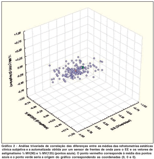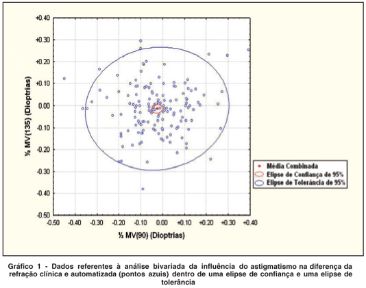 Para quantificar a importância do astigmatismo na diferença entre a refração clínica e automatizada, realizou-se a análise bivariada com a construção de um gráfico, onde cada ponto representa a diferença entre as refrações nos seus vetores. Quanto mais próximo das coordenadas zero, menor é a influência do astigmatismo nas diferenças entre as refrações. Por cálculos matemáticos construiu-se duas elipses onde suas abrangências dependem da variabilidade das diferenças refracionais (Gráfico 1).