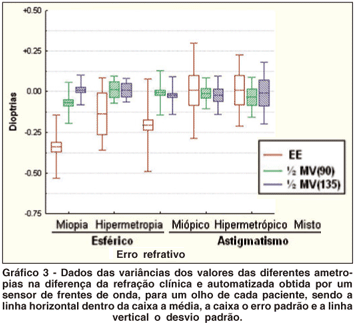 Uma dificuldade encontrada na comparação dos resultados é a magnitude dos valores refracionais obtidos pelo sensor de frentes de onda, dada com frações de 0,01 D e na refração clínica frações de 0,25 D. Por estes dados não encontramos nenhuma refração esférica simples nas obtidas pelo sensor de frentes de onda.