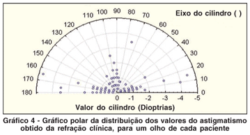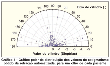 Com os dados refracionais podemos montar gráficos polares para mostrar a distribuição dos valores dos astigmatismos obtidos tanto para a refração clínica como a automatizada. Nos gráficos 4 e 5 os resultados são para um olho de cada paciente. Observar a distribuição dos valores onde no gráfico da refração clínica os valores são frações de 0,25, enquanto que no gráfico da refração automatizada são frações de 0,01.