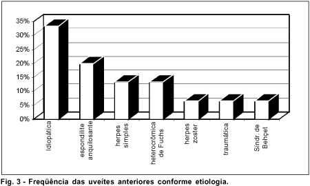 Menos freqüente (22%), a uveíte anterior apresentou as mais variadas causas, dentre elas destaca-se a espondilite anquilosante (20%), doença de Fuchs (13,3%), herpes simples (13,3%), herpes zoster (6,66%), doenca de Behçet (6,66%), trauma (6,66%) e com predomínio de causa idiopática (33,5%) (Fig. 3).