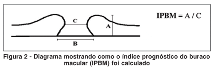 Com as medidas isoladas foi possível calcular (Figura 2): Índice prognóstico do buraco macular (IPBM) - obtido pela divisão da altura dos bordos pelo diâmetro da base interna do BM.