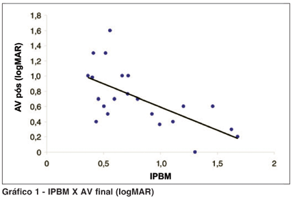 Por outro lado, a variável IPBM tem uma correlação negativa significante na AV final, ou seja, quanto maior o valor desta variável menor a AV na escala logMAR (melhor visão).