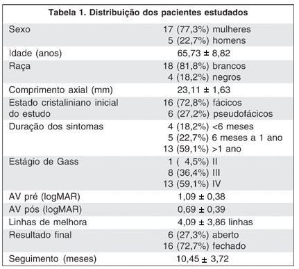 Com base na classificação biomicroscópica de Gass, os BM foram divididos em: 1 (4,5%) estágio II, 8 (36,4%) estágio III e 13 (59,1%) estágio IV.