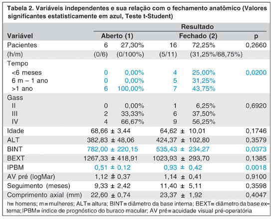 Outras variáveis incluíram sexo, idade, etnia, estágio do BM pela classificação biomicroscópica de Gass, tempo do aparecimento da doença informado pelo paciente (<6 meses, 6 meses - 1 ano, >1 ano), acuidade visual pré e pós-operatória utilizando o logaritmo de mínimo ângulo de resolução (logMAR) e o resultado anatômico da mácula após a cirurgia.