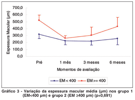 A espessura macular retiniana (EM) média ± DP pré-tratamento foi de 399 (±121 µm) para os 20 olhos analisados. No 1º mês a melhora foi de 39,9% (239 ± 53 µm); no 3º mês foi de 35,9% (255 ± 93 µm); no 6º mês foi de 18,1% (326 ±135 µm) (Gráfico 2).