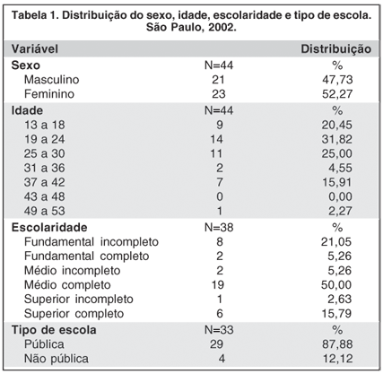 O exame da tabela 1 sugere para a variável sexo, predominância de pacientes do sexo feminino com 23 (52,27%) citações, todavia, o teste de Qui-quadrado nos oferece evidência de que tal predominância não é estatisticamente significativa (p=0,878). Sugere para a variável idade, predomínio de pacientes com idade entre 19 e 24 anos com 14 (31,82%) citações, valor médio de 25,98 (desvio-padrão de 8,81) e variação de 13 a 53 anos. A aplicação do teste de Qui-quadrado ofereceu evidência estatística da não homogeneidade da distribuição das idades (p<0,0001). Além disso, mais de 50% dos pacientes tinham idade inferior a 24 anos. Sugere para a variável escolaridade, predominância do nível médio completo com 19 (50,0%) e para a variável tipo de escola, predominância de escola pública com 29 (87,88%) citações. A aplicação do teste de Qui-quadrado oferece evidência da não homogeneidade da distribuição da escolaridade (p<0,001) e da distribuição da escola pública (p<0,001).