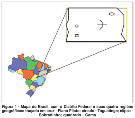 Para a identificação da procedência dos pacientes foram utilizadas duas diferentes classificações: (I) quanto ao estado de origem: (i) origem interna (aqueles pacientes provenientes do próprio DF) ou (ii) origem externa (os pacientes provenientes de outros estados que não o DF); (II) quanto à região geográfica: neste caso, objetivou-se determinar de que região do DF os pacientes eram provenientes: 1) região do "Plano Piloto" - área central da planta de Brasília, onde se localiza o PSHB; 2) região de "Taguatinga" - área oeste; 3) região de "Sobradinho" - área nordeste; 4) região do "Gama" - área sudeste (Figura 1). Alguns pacientes de outros estados que circundam o DF foram classificados geograficamente como provenientes de uma das regiões do DF mais próximas de sua cidade. Por exemplo, pacientes provenientes de cidades do interior da Bahia, utilizam como porta de entrada para o DF a região de Sobradinho (Nordeste), e estes foram então classificados como sendo provenientes desta região, uma vez que esta é a cidade satélite do DF mais próxima geograficamente da cidade baiana de origem, e nela que o paciente seria atendido caso houvesse ali um PS oftalmológico. No caso de Goiás - estado que circunda por completo o DF - os pacientes foram geograficamente classificados como provenientes da região geográfica do DF mais próxima da cidade de Goiás de onde ele veio. A classificação geográfica não leva em conta se o paciente é externo (fora do DF) ou interno (de dentro do DF). O objetivo desta classificação é justamente o de se identificar o melhor local para se instalar uma nova unidade pública de emergência oftalmológica que contemplasse pacientes do DF e do seu entorno.