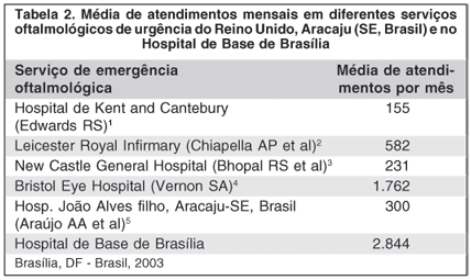 Um total de 2.844 indivíduos foi registrado entre os dias 1 e 30 de setembro de 2003. A tabela 2 exibe o número de atendimentos em diferentes serviços de emergência oftalmológica e também no PSHB.