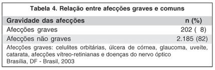 Apenas 8% (n=202) dos pacientes apresentavam afecções consideradas graves como celulites orbitárias, úlceras de córnea, glaucoma, uveítes, cataratas, doenças vítreo-retinianas ou do nervo óptico. Ou seja, na grande maioria dos casos, os pacientes foram diagnosticados com doenças que não representavam séria ameaça à visão, o que aponta para uma falha na organização do PSHB, uma vez que o atendimento emergencial é realizado por médicos formados, com no mínimo 5 anos de término de suas residências médicas, sendo que vários destes possuem sub-especializações no Brasil e/ou no exterior, e pós-graduações em nível de mestrado e/ou doutorado. Assim, médicos oftalmologistas com sub-especializações são escalados para realizar atendimentos primários em oftalmologia que poderiam ser executados por alunos da graduação, médicos generalistas ou por residentes em oftalmologia; estes então encaminhariam os casos mais graves para os sub-especialistas. Este sistema se mostrou eficiente em outros centros de emergência oftalmológica(1,4,6).