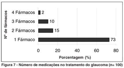 O custo médio da medicação hipotensora ocular variou muito ao longo de trinta anos, estando este consideravelmente maior na última década e determinando o predomínio de colírios beta-bloqueadores(18). Nosso estudo confirmou esse dado, já que 53,8% dos fármacos utilizados no controle do glaucoma eram beta-bloqueadores. Setenta e três por cento dos nossos pacientes fizerem uso de colírio ou droga de administração oral em monoterapia. Em uso de 3 ou 4 medicações, foram encontrados apenas 12% da população. Esses dados são contrários aos achados do estudo da UNIFESP em que apenas 29% dos pacientes utilizavam monoterapia no primeiro atendimento de um serviço de glaucoma.
