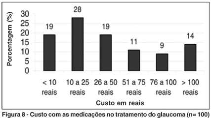 Em nossa amostra, 28% dos pacientes gastaram de 10 a 25 reais/mês e 29% gastaram de 26 a 75 reais/mês com o tratamento do glaucoma, recorrendo ao uso de mais de 1 fármaco para o controle adequado da PIO em 27% dos casos. Um outro estudo apontou que o colírio de maior custo representa um impacto econômico mensal de 29,1% sobre o valor do salário mínimo. A terapia combinada em apresentações separadas apresenta menor custo que as associações de drogas em apresentação única(16).