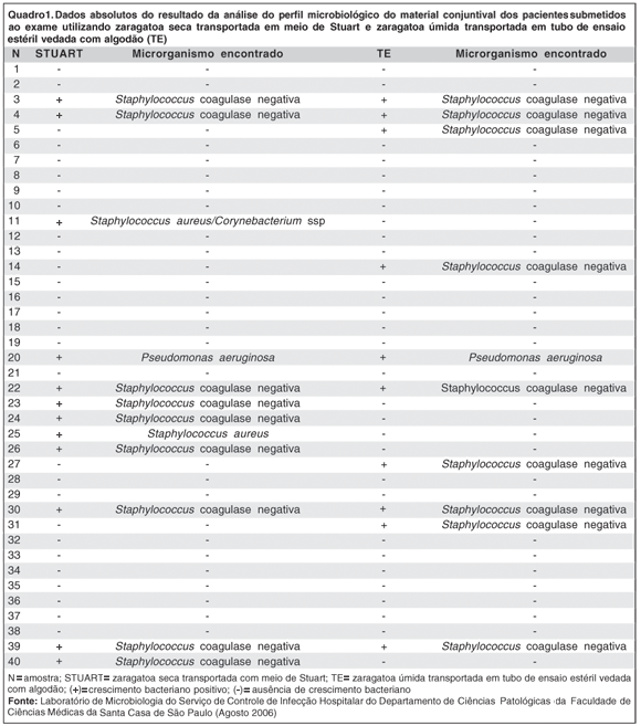 Das 40 amostras coletadas com zaragatoa úmida e transportadas no tubo estéril vedado com algodão, foi observada positividade em 10 (25%). Das 40 amostras coletadas com zaragatoa seca e transportadas no meio de Stuart, foi observada positividade em 12 (30%). Essas diferenças não se mostraram estatisticamente significantes (p= 0,85) (Quadro 1).