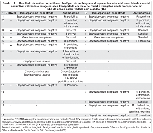 No resultado da análise do antibiograma dos microrganismos encontrados (Quadro 2), observamos que 6 pacientes (12 amostras) possuem o mesmo perfil bacteriológico em culturas provenientes de ambos os meios de transporte. Observamos também, que em 6 pacientes, houve crescimento bacteriano usando apenas o meio de transporte de Stuart, sendo negativas as amostras coletadas com a zaragatoa úmida. Em 4 pacientes, houve o crescimento bacteriano apenas nas amostras coletadas pela zaragatoa úmida.