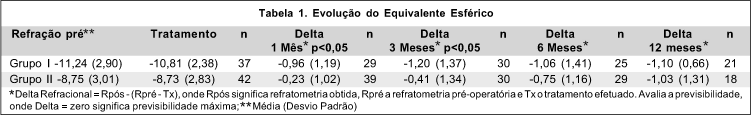 A refração pré-operatória, o tratamento realizado e o Delta Refracional do 1º, 3º, 6º e 12º meses encontram-se na Tabela 1. A média do equivalente esférico pré-operatório no Grupo I foi de ¾11,24 D (±2,90) e de ¾8,75 D (±3,01) no Grupo II. A média do tratamento realizado foi de ¾10,81D (±2,38) no grupo I e ¾8,73D (±2,83) no grupo II. O Delta Refracional foi estatisticamente diferente (p<0,05) nos meses 1 e 3. A Tabela 2 apresenta a distribuição do Delta Refracional em intervalos, na última visita. No Grupo I ocorreram 22 casos (59,5%) com hipocorreções acima de 1,00D, enquanto que no grupo II ocorreram 12 casos (28,6%) (p<0,05). Todos os pacientes possuíam acuidade visual sem correção (AVsc) pré-operatória pior ou igual a 20/200. Após o tratamento, 17 olhos (45,9%) do Grupo I e 31 olhos (73,8%) do Grupo II apresentaram AVsc melhor ou igual a 20/40 (Tabela 3).
