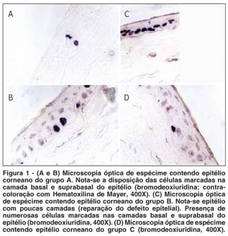 Nesta investigação, as médias e os desvios-padrão das células marcadas pela BrdU nos grupos A, B e C foram, respectivamente, de 7,17 ± 0,74; 37,15 ± 3,01 e 0,22 ± 0,10 células por 100 células basais (Tabela 1). As diferenças entre os grupos foram estatisticamente significantes pela prova de Dunn (p<0,05*). Proporcionalmente, o grupo que foi submetido à desepitelização de córnea (grupo B) apresentou um aumento no número de células marcadas de 5,18 vezes em relação ao grupo com epitélio normal (grupo A); por outro lado, a instilação do 5-fluoruracil por 4 dias diminuiu o número de células marcadas 32,5 vezes em relação ao grupo controle.