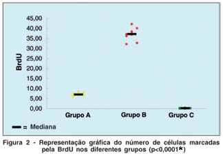 A figura 2 é uma representação gráfica das variações encontradas no número de células marcadas usando o marcador BrdU nos 3 grupos (A, B e C).