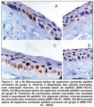 A figura 3 ilustra o padrão de marcação do Ki-67 nos diferentes grupos. As células marcadas pelo Ki-67 apresentavam núcleos de coloração marrom e estavam presentes na camada basal e suprabasal do epitélio. Células aos pares (células recém-divididas) podiam ser detectadas em algumas lâminas (Figuras 3A e 3B).