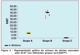 A figura 4 é uma representação gráfica das variações encontradas no número de células marcadas usando o marcador Ki-67 nos 3 grupos (A, B e C).