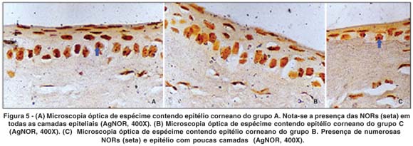 As regiões organizadoras nucleolares (AgNORs), coradas pela prata, foram detectadas como grânulos escurecidos, por vezes de coloração marrom, localizados no interior dos núcleos celulares. As AgNORs foram detectadas nas células de todas as camadas do epitélio corneano, mas só foram analisadas as AgNORs das células da camada basal. A figura 5 ilustra o padrão de marcação do AgNOR nos diferentes grupos.