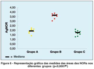 A figura 6 é uma representação gráfica das variações encontradas nas medidas das áreas das NORs nos 3 grupos (A, B e C).