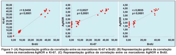 Os marcadores BrdU, Ki-67 e AgNOR apresentaram uma correlação positiva e estatisticamente significante nos diferentes grupos (Figura 7).