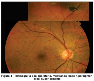 Procedemos com tratamento via oral com acetazolamida 250 mg de 8/8 h, prednisona 80 mg/dia, assim como acetato de prednisolona 0,1% e maleato de timolol 0,5% tópicos. Indicou-se vitrectomia via pars plana para remoção do cisticerco, que foi realizada após 7 dias de tratamento clínico. No intra-operatório, observaram-se traves vítreas fortemente aderidas ao cisto e uma lesão hiperpigmentada no equador em quadrante nasal superior (Figura 4). No momento em que as traves vítreas foram liberadas ocorreu a ruptura do cisto e optou-se por sua completa remoção seguido de injeção intravítrea de dexametasona (400 mg) e endofotocoagulação a laser 360º.