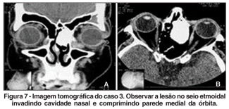 A invasão orbitária é relativamente incomum, ocorrendo em 0,9% a 5,1% dos casos(5,7-16). Quando invadem a região da fossa lacrimal, podem simular ou evoluir com quadro de obstrução das vias lacrimais, condição que é pouco freqüente(17).