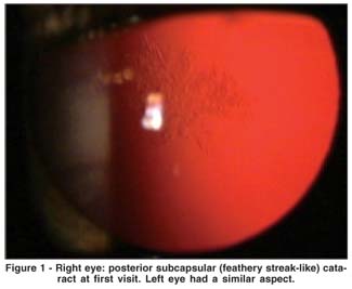 Paciente de 13 anos, com história recente de hiperglicemia, desenvolveu subitamente, catarata subcapsular posterior em ambos os olhos, consistindo de finas opacidades dispostas em forma de pena. A acuidade visual não corrigida era de 20/50 e de J4 para perto, em ambos os olhos. Sob cicloplegia, verificou-se em ambos os olhos uma moderada refração hipermetrópica. Foi, então, diagnosticado caso agudo de catarata subcapsular posterior secundária ao diabetes mellitus. Observou-se resolução total da opacidade subcapsular posterior em ambos os olhos duas semanas após regressão do quadro hiperglicêmico, assim como redução da refração hipermetrópica com melhoria da acuidade visual.