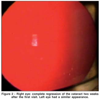 Serum glucose level in the first examination was 420 mg/ml and after a period of two weeks, with efficient control and stabilization of glycemia (89 mg/ml), a complete regression of lens opacities was observed in both eyes leaving the patient with clear lenses (Figure 2).