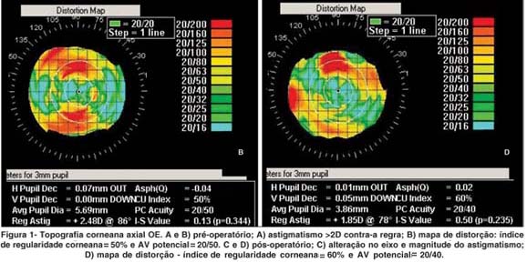 Evoluiu no pós-operatório sem intercorrências e após um mês de cirurgia, a despeito da ótima evolução clínica, a melhor AVSC do paciente era 20/60 para longe e J3 para perto. Após refração, passou a 20/40 parcial e J1 com refração de Plano -1,00 cil 75º e +3,00 esf, respectivamente. Realizou-se nova topografia corneana, que manteve a irregularidade pré-operatória, com alteração do astigmatismo em seu eixo, porém abaixo do esperado na sua magnitude (43,71 a 164º x 41,97 a 74º) (Figuras 1 - C e D). Foi solicitado angiofluoresceinografia retiniana do OE, que não demonstrou alterações significativas que justificassem a AV. Optou-se então pelo explante da LIO AcrySof® ReSTOR® e implante de uma LIO AcrySof® monofocal, de 20,50 D e constante 118,4, conforme biometria pré-operatória. Após uma semana, a cirurgia foi realizada com êxito e, no sétimo dia pós-operatório, a AV obtida para longe era de 20/25 parcial, com refração (+2,25 -2,50 80º), e para perto J1 com adição de +3,00.