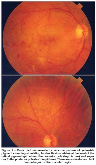 Slit-lamp examination of the anterior segments was unremarkable. Intraocular tension was within normal limits in both eyes. Fundus examination of the RE showed a reticular pattern of yellowish clumping of pigment simulating fundus flavimaculatus at the level of the retina pigment epithelium (RPE) throughout the fundus (Figure 1). There was an area of subretinal white infiltration surrounding the foveal region, as well as dot and blot hemorrhages. The posterior vitreous showed a mild inflammatory response. There was sheathing of the retinal vessels near the white infiltrate. The left eye fundus showed few microaneurysms and dot hemorrhages.