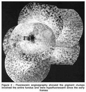 Fluorescein angiography of the involved eye revealed that the pigment clumps were hypofluorescent throughout the examination, on a background of greater than normal fluorescence (Figure 2). An area of capillary drop-out was observed surrounding the fovea, which corresponded to the infiltrate seen on standard photograph. The hypofluorescent spots corresponded to retinal yellowish flecks. Angiograms of the LE revealed few microaneurysms and dot hemorrhages in the posterior pole. The diagnosis of retinal involvement secondary to SNHL was proposed and the patient was referred to oncology service. Further investigation indicated that the patient had a cervical lymphadenopathy and the retinal lesions were interpreted as a likely signs of CNS recurrence of SNHL. Cerebrospinal fluid revealed presence of neoplastic cells, which confirmed CNS involvement. The patient then started a new chemotherapy regimen. However, his general condition deteriorated, and he died soon afterward.