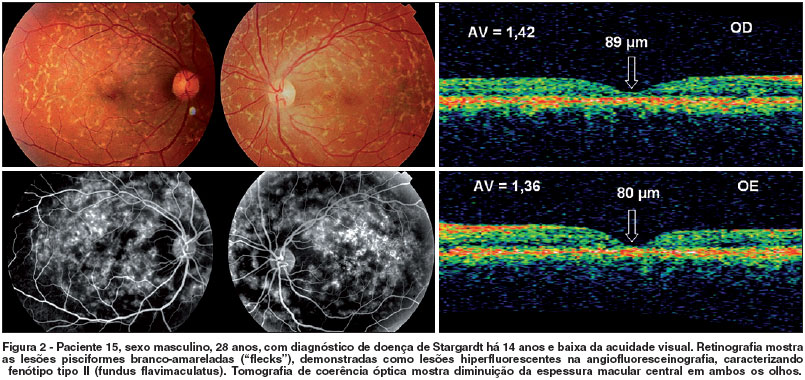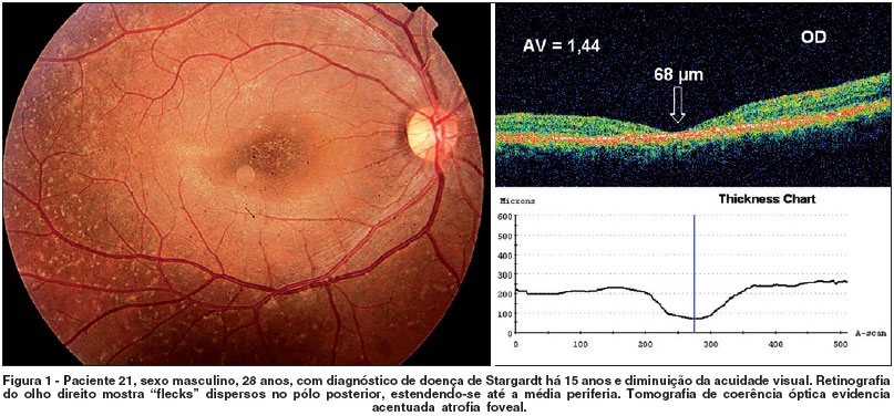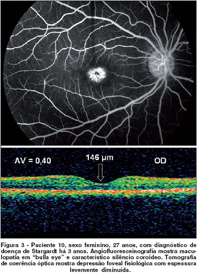 Recentemente, a tomografia de coerência óptica, também conhecida pela sigla em inglês OCT, método diagnóstico que permite fornecer imagens de alta resolução das estruturas retinianas seccionadas transversalmente(12), vem sendo utilizada para detectar alterações maculares nas distrofias retinianas(13-15). Acredita-se que ERG multifocal e OCT possibilitam quantificar alterações intra-retinianas em fases precoces da doença de Stargardt, auxiliando no prognóstico para o doente.